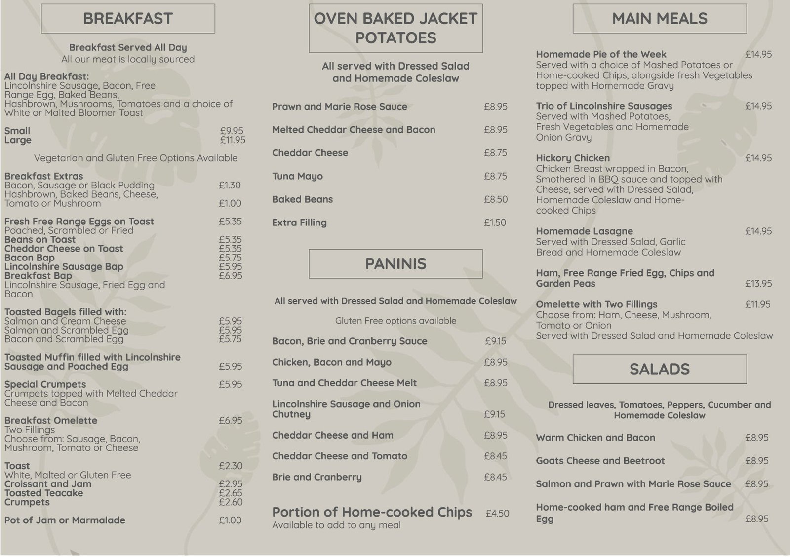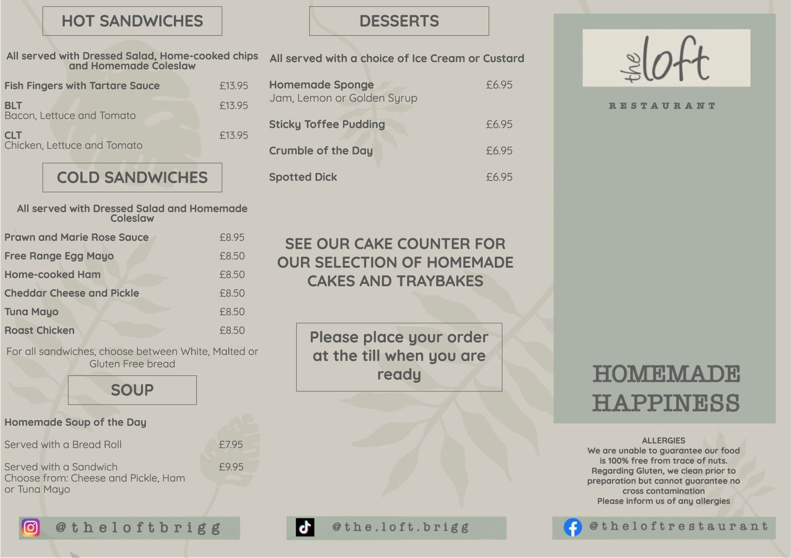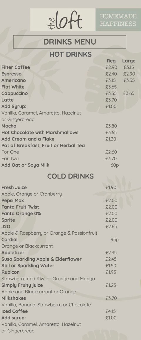 At The Loft Restaurant Brigg we have a diverse menu to go along with our daily specials. Our menus includes a wide range of delicious home cooked food and sweet treats in addition to our range of both hot and cold drinks. You can see our full menus below.